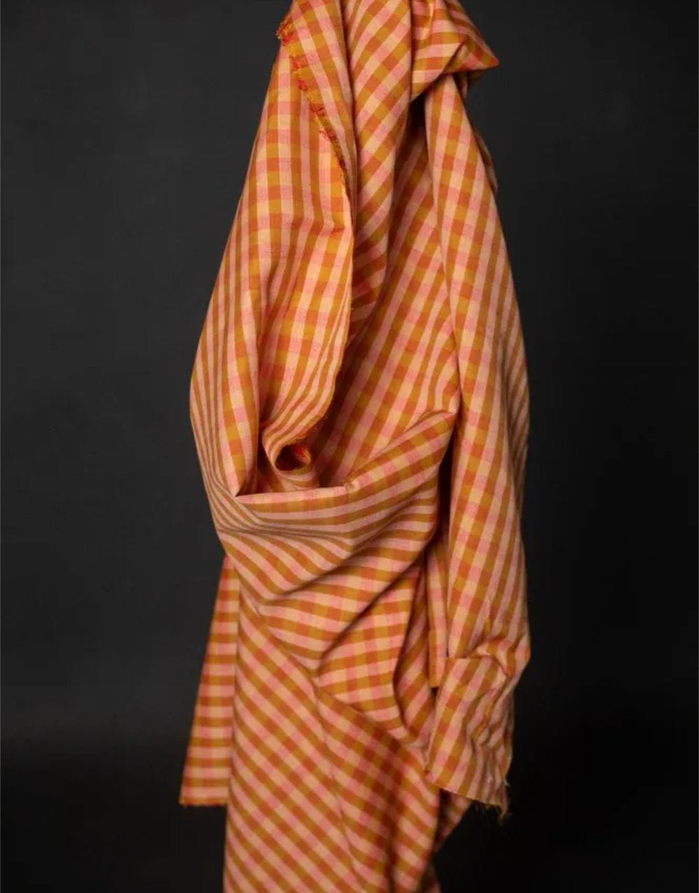 A soft cotton and linen blend in a cheery check of raspberry pink and mustard yellow. It is a versatile cloth that is a great alternative to linen. Summer weight cloth suitable for dresses, tops, shirts and skirts.
