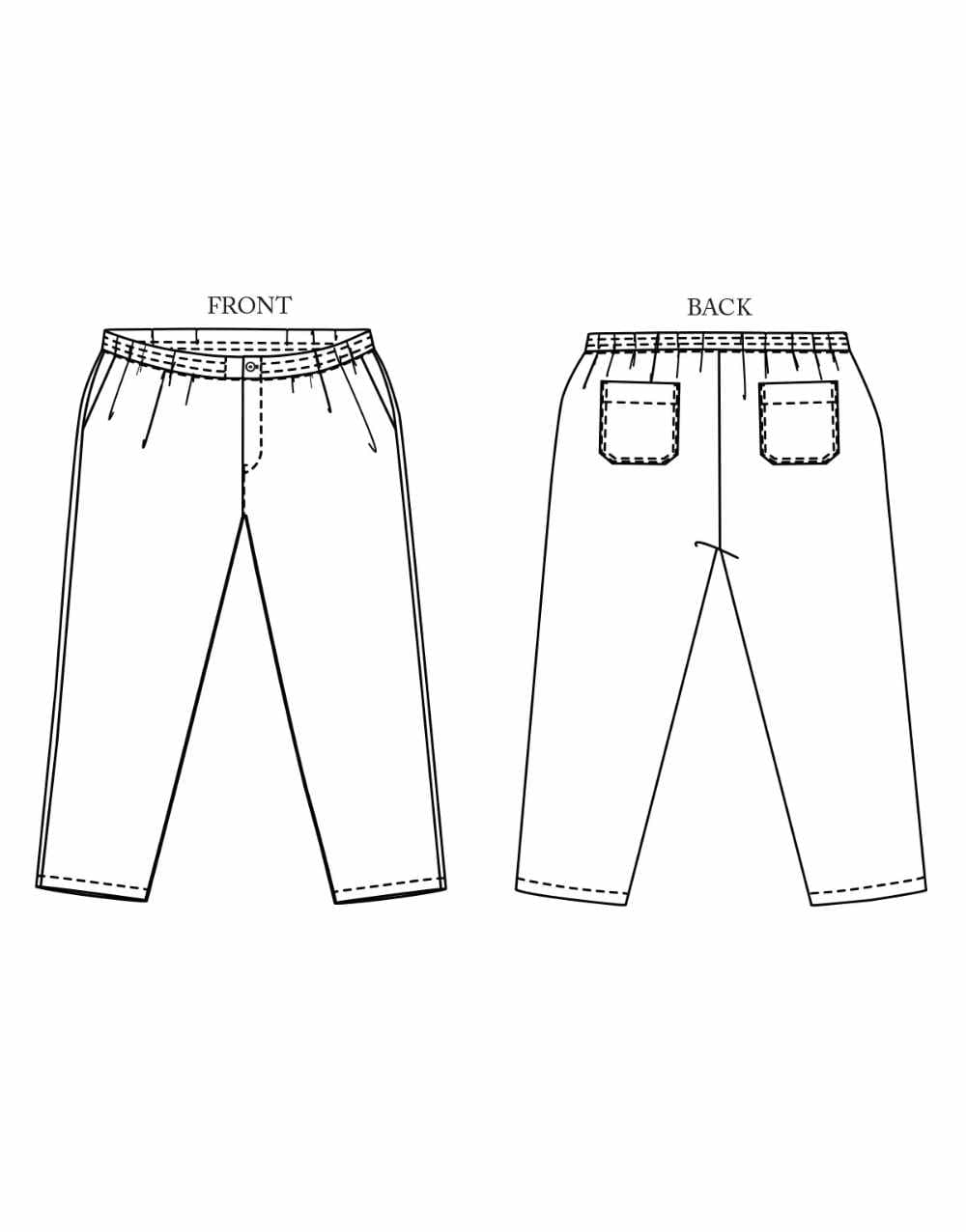 An everyday men's elasticated trouser with front slanted pockets and back patch pockets. Make them with or without a zip.