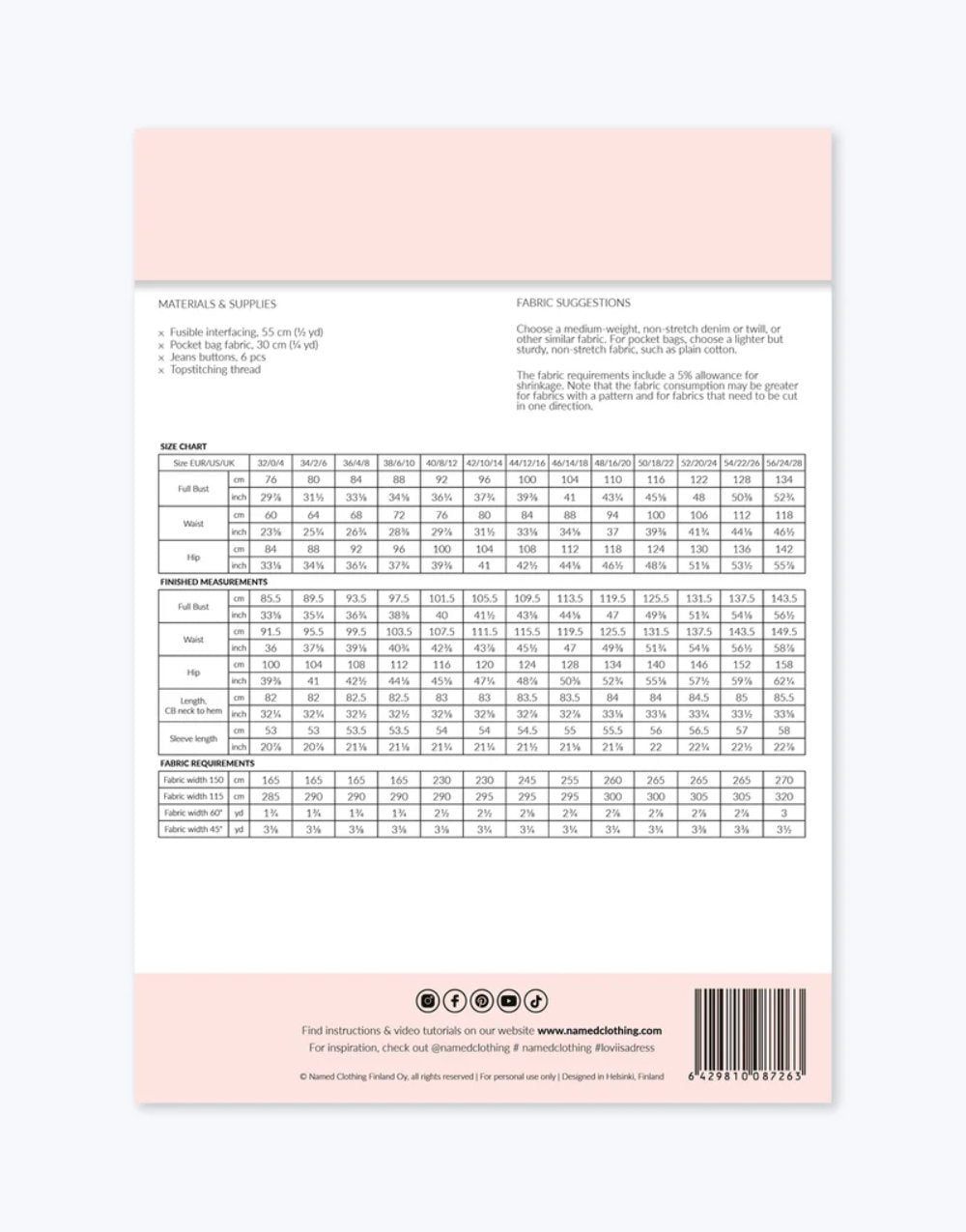All Named patterns are designed for a 172 cm (5ft 8in) tall person. Take your own measurements and compare them to the size chart to select your size:
