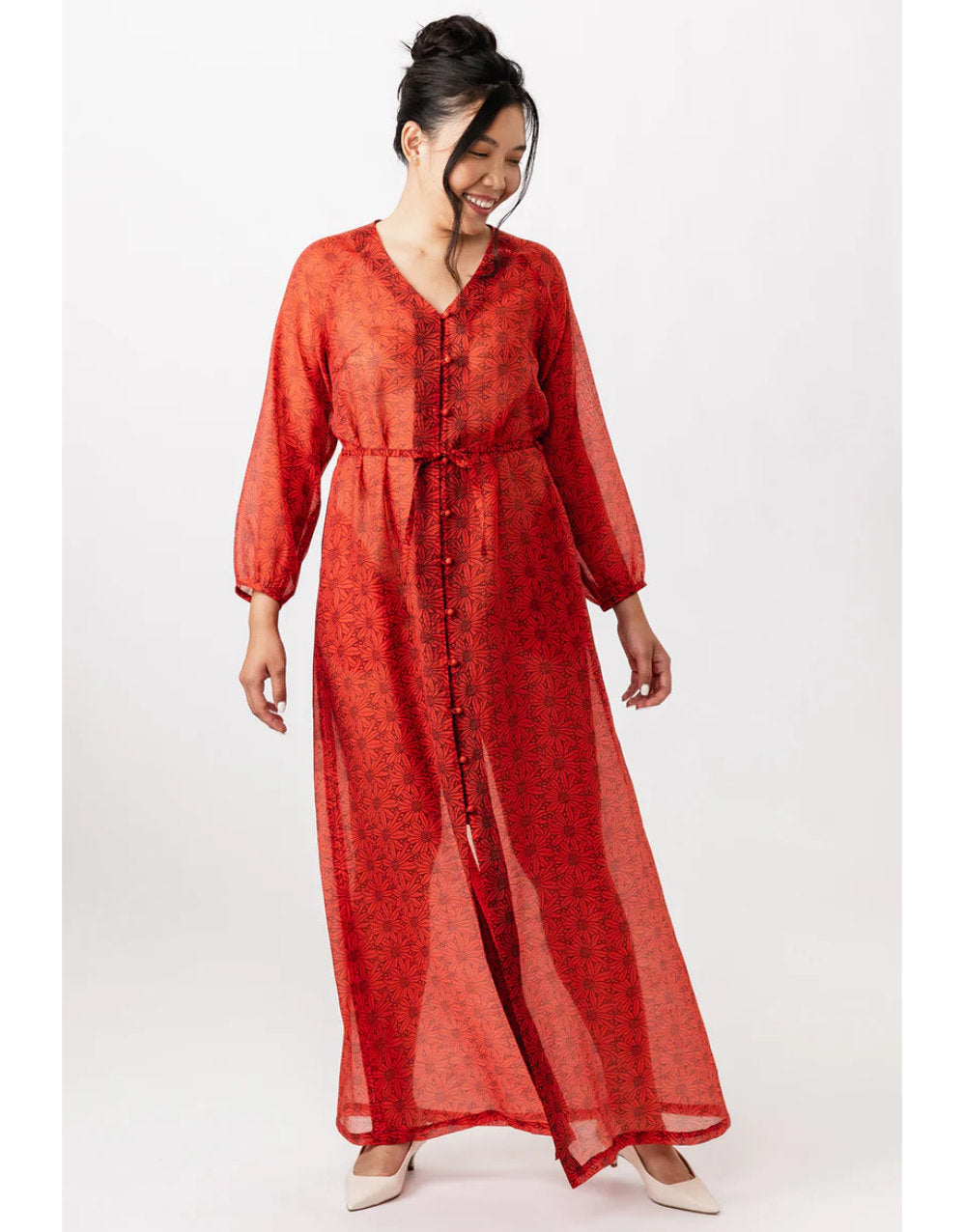 The Maite sewing pattern includes two variations: a chic tunic, and an elegant maxi dress. Both feature raglan sleeves, a straight cut, and a delicate belt at the waist. The tunic has an O-neck, fastening with ties, straight ¾-length sleeves, and side slits. The dress comes with a V-neck, long puff sleeves, smart side pockets, and fastening with shank buttons.