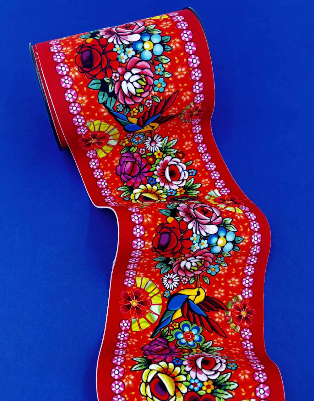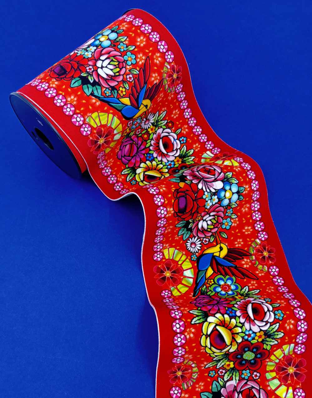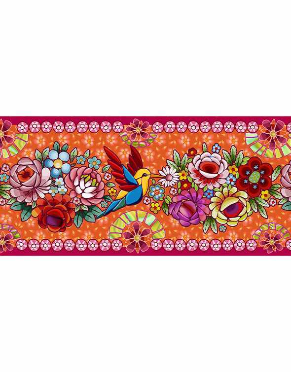 This mosaic-inspired border is adorned with flowers and birds. The decorative edge allows for lots of creative finishing touches. These pretty printed velvet borders make fabulous bags and original cushions. You can also embroider them, and turn them into cases or pouches. The fabric is a heavy weight polyester velvet which is suited to upholstery projects too.