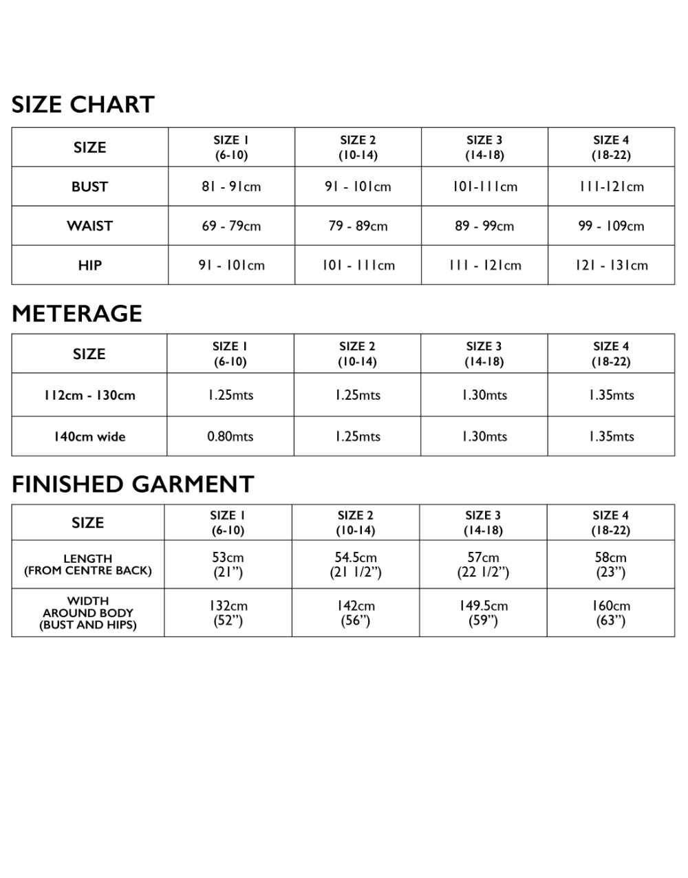 Sizes (AUS): Size 1 (6-8-10) Size 2 (10-12-14), Size 3 (14-16-18), Size 4 (18-20-22)