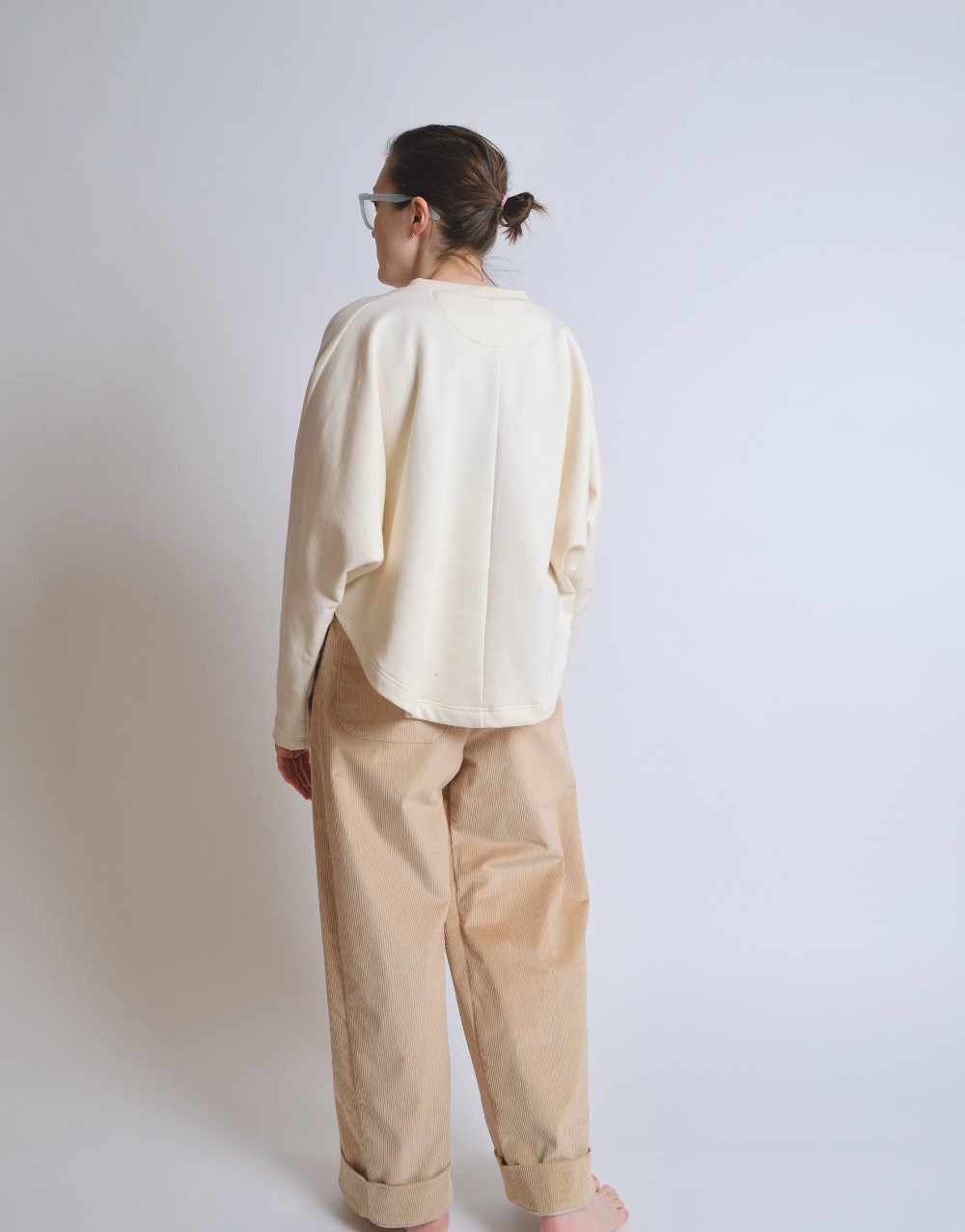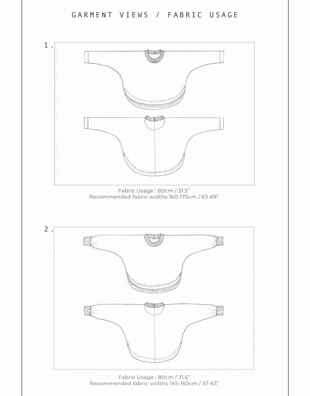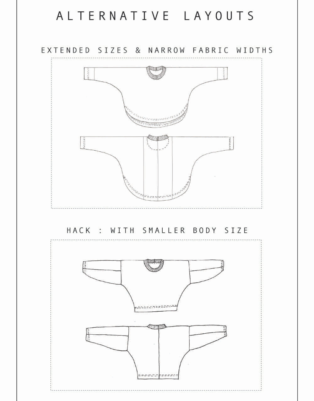 The Zero Waste (ZW) Jumper has an oversized body with a curved hem and a slim sleeve making it perfect for layering. The body size and sleeve length are determined by the fabric width you use.