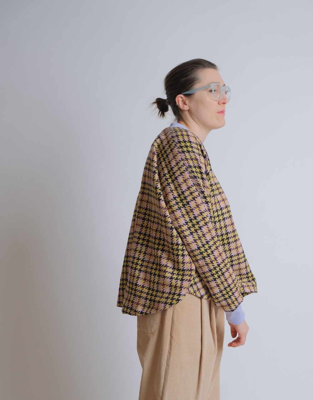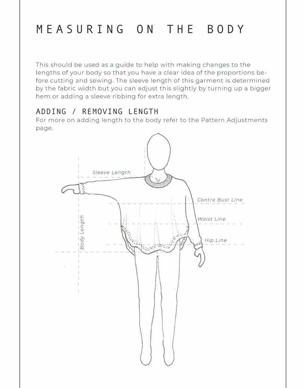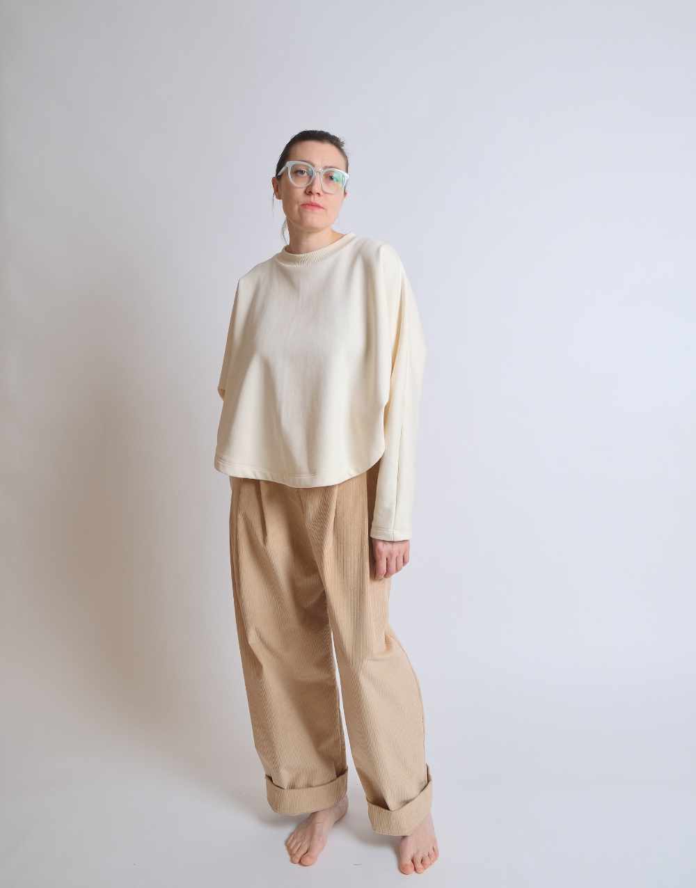 The Zero Waste (ZW) Jumper has an oversized body with a curved hem and a slim sleeve making it perfect for layering. The body size and sleeve length are determined by the fabric width you use.