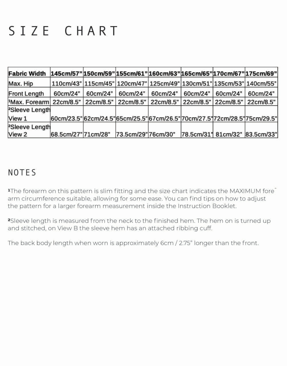 This pattern is considered a one size garment. The finished garment size is determined by the fabric width and the pattern is suitable for widths between 145-175cm / 57-69".  This size chart shows the MAXIMUM hip size suitable for each fabric width and includes a generous amount of ease. The forearm of this pattern is slim fitting and the size chart indicates the MAXIMUM forearm circumference suitable for all fabric widths, allowing for a small amount of ease. You can find tips on how to adjust the sleeve for a larger forearm measurement inside the instruction booklet.