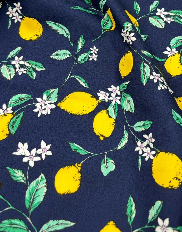 Vibrant yellow lemons on a navy cotton poplin. A firm favourite in the sewing room, our Printed Cotton Poplin is a versatile essential for all sorts of makes. With a soft, smooth finish and lovely lightweight drape, it’s perfect for everything from crisp shirts and floaty dresses to patchwork projects and pretty home accessories. Available in an ever-changing mix of modern and retro designs - think ditsy florals, bold botanicals, and charming classics - there’s something here for every style and season. Easy to sew and easy to wear, this fabric makes a great starting point for beginners and a reliable go-to for seasoned stitchers.