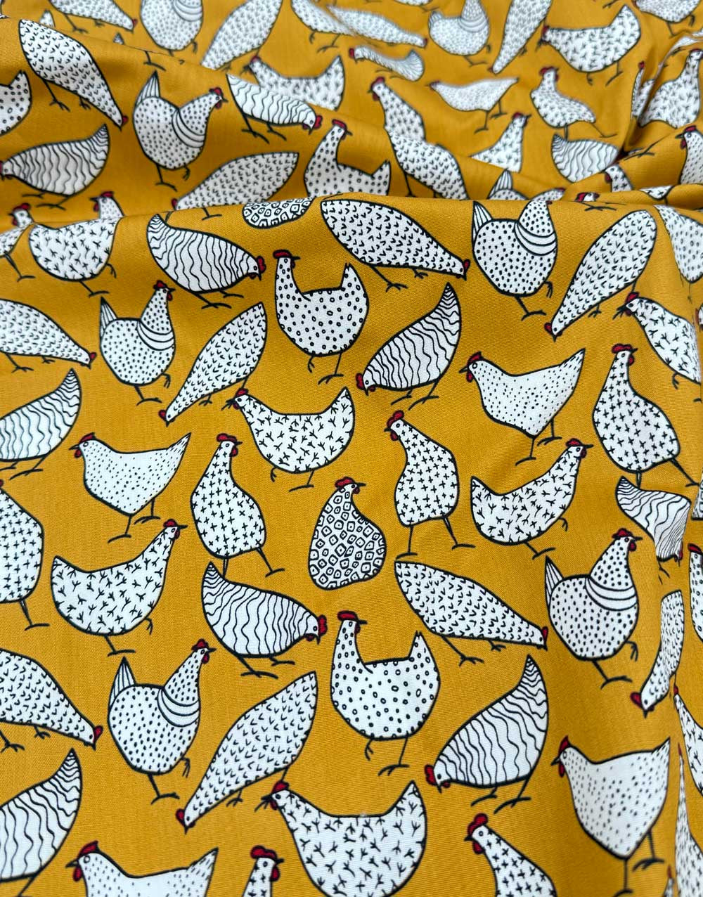 A cheerful flock of quirky chickens parades across an ochre background in this playful printed cotton poplin. Each hen is drawn with whimsical black linework and filled with ditsy patterns like dots, crosshatches, squiggles, and stars, making this fabric a real cluckin’ delight! With its smooth feel and lightweight structure, it’s ideal for fun sewing projects that don’t take themselves too seriously.