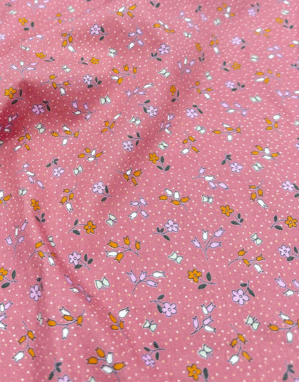 A scattering of tiny blossoms in lilac, white, orange and coral dances across a warm rosy pink background, sprinkled with soft white polka dots. This ditsy floral cotton poplin has a sweet vintage feel, perfect for adding charm and colour to your sewing projects. Crisp, lightweight and easy to handle - ideal for all kinds of pretty makes.