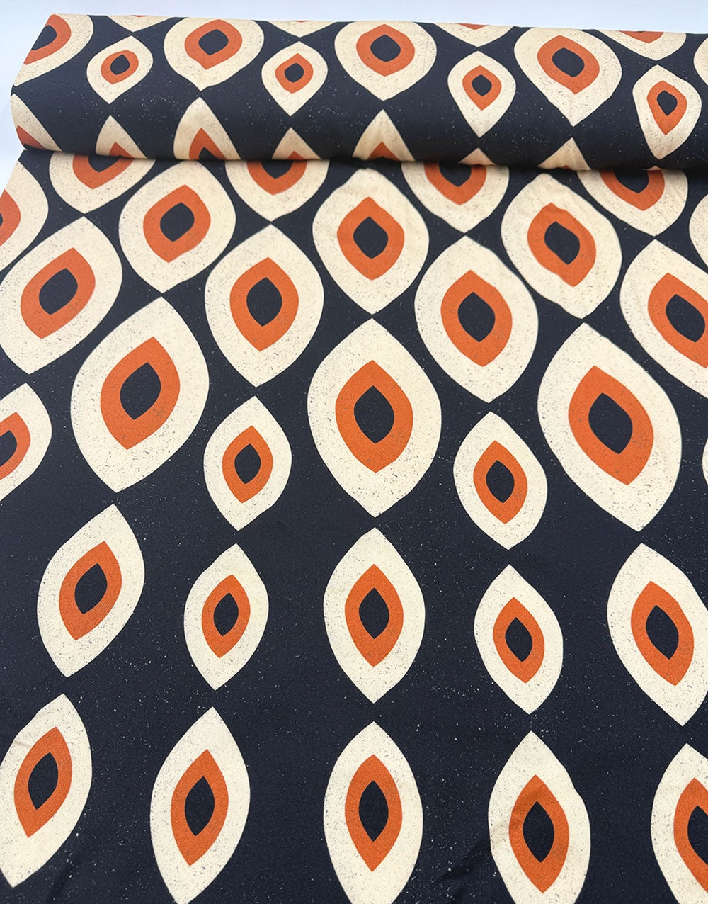 A bold and beautifully rhythmic print, this viscose features a stylised “eye” motif in warm cognac and soft cream, set against a deep charcoal black ground. The shapes have a hand-printed, slightly textured look, giving the design a touch of vintage charm.
