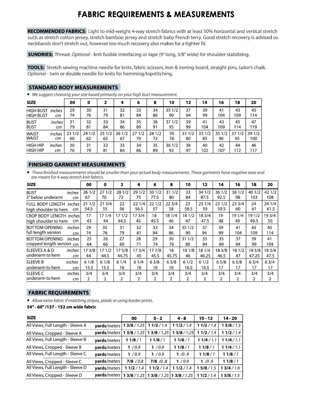 Sleeve D: 54-60″ (137-152 cm) wide fabric: Full length tee, 1 3/4 – 2 5/8 yd (1.6 – 2.4 m) // Cropped tee, 1 5/8 – 2 3/8 yd (1.5 – 2.2 m).