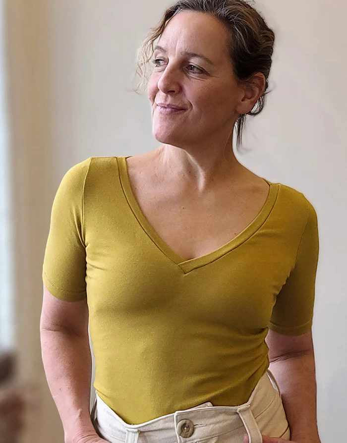 Light to mid-weight 4-way stretch knit fabrics with at least 50% horizontal and vertical stretch, such as stretch cotton jersey, stretch bamboo jersey and stretch baby French terry. Good stretch recovery is advised so the neckband doesn’t stretch out, but too much recovery can make for a tighter fit.