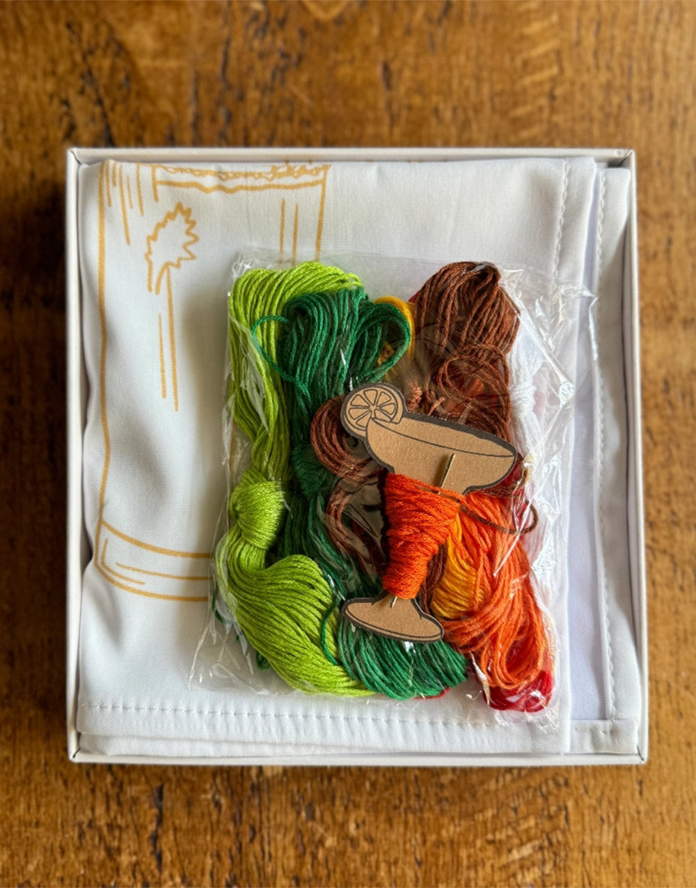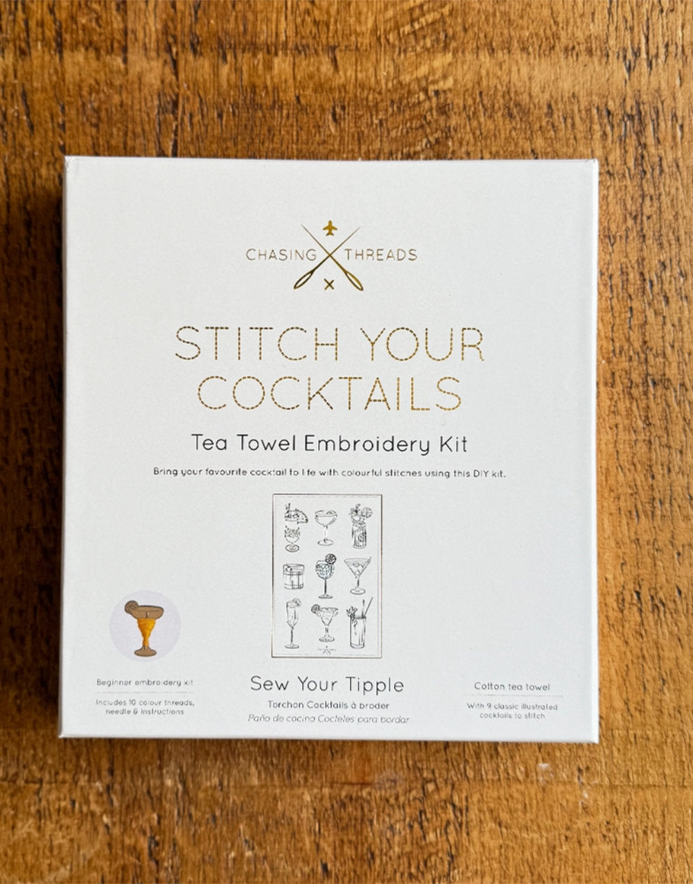 This lovely tea towel is covered with luxe gold illustrations of nine classic cocktails. Whether you stitch each cocktail or just your favourite(s), the tea towel will quickly come to life with colourful embroidery!