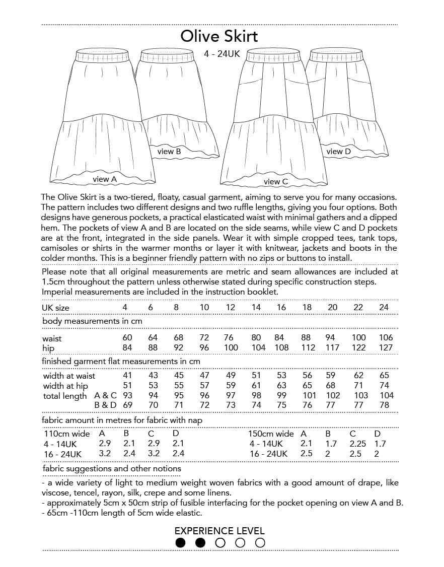 The Olive Skirt is a two-tiered, floaty, casual garment, aiming to serve you for many occasions. The pattern includes two different designs and two ruffle lengths, giving you four options to choose from. Both designs have generous pockets, a practical elasticated waist with minimal gathers and a dipped hem.
