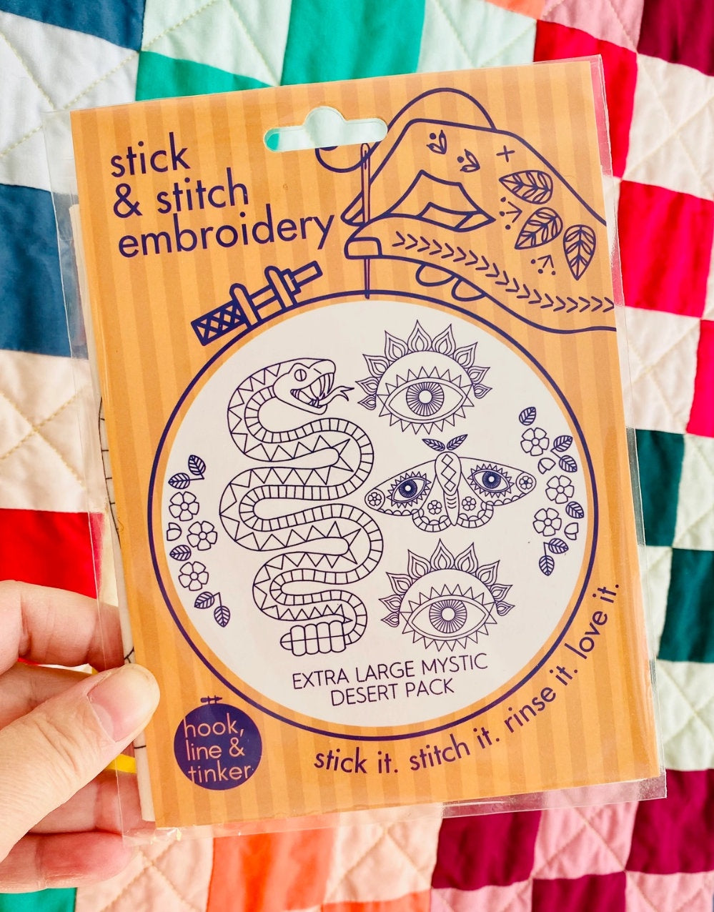 Looking to update or personalize your wardrobe or home textiles with a bit of WOW? Then try Hook, Line & Tinker's latest Stick & Stitch designs to create one-of-a-kind fabulousness! Inspired by the mystic desert this kit features rattlesnakes, mystic eyes, moths and wild roses.