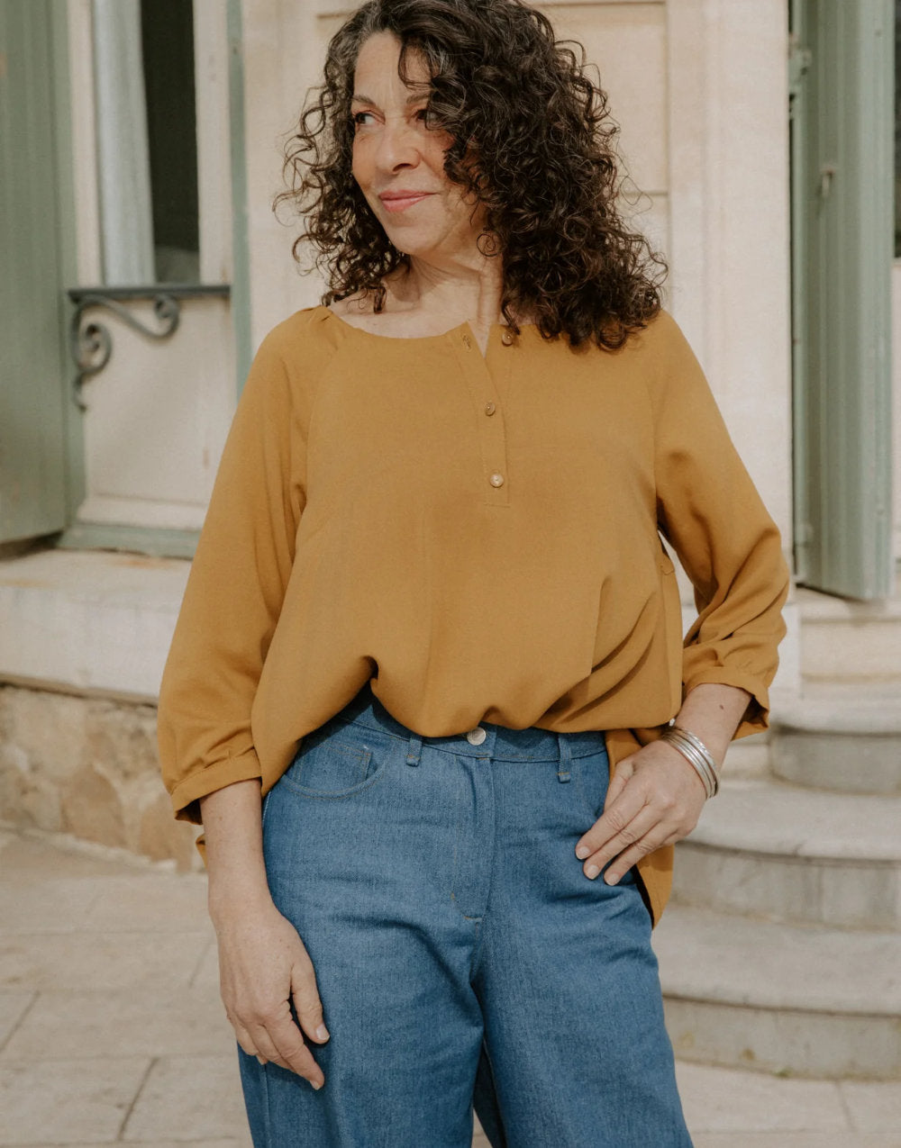 The Hespéride blouse is an exquisite piece, featuring a gracefully flared silhouette, structured with elegant panelling and a captivating back design. Crafted with comfortable raglan sleeves, it has a wide, rounded neckline that can be styled with or without a button placket.