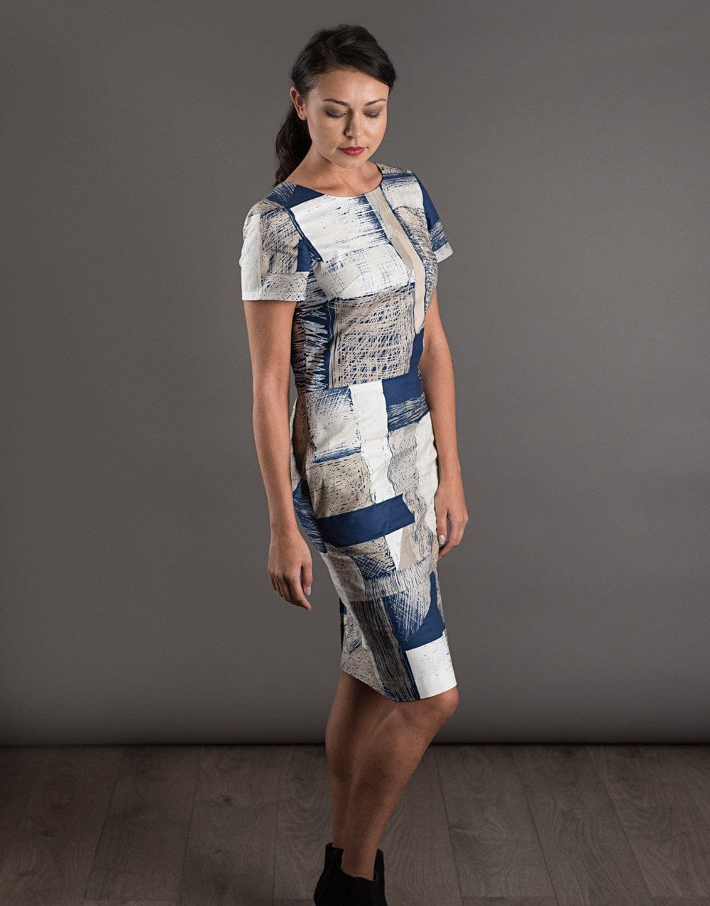 The Shift Dress has a fitted bodice, fitted sleeves and pencil skirt with a panel at the bottom of the front skirt. The back of the skirt has flattering waist pleats, a kick pleat at the bottom with the back bodice finished with an invisible zip. Pattern includes optional inner pockets. Sizing UK 6-22