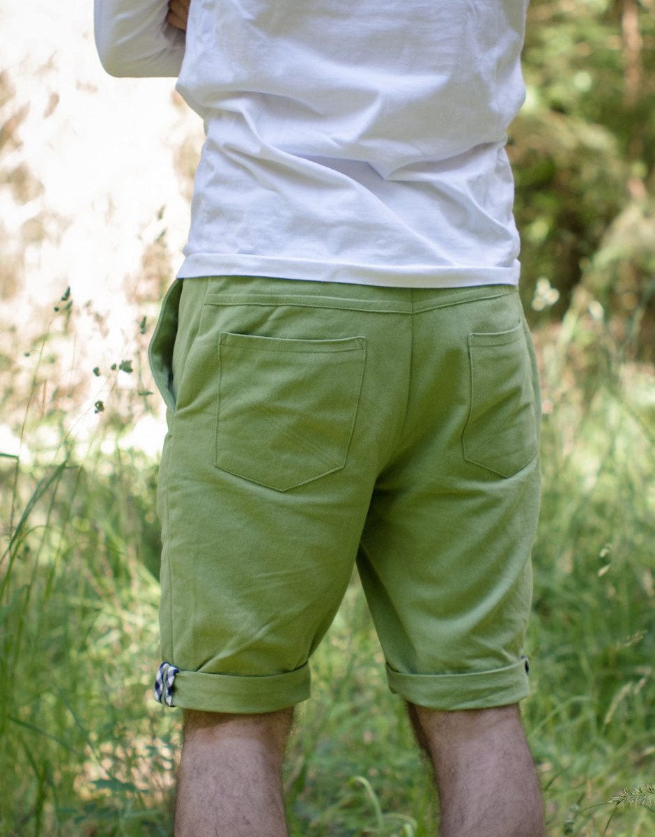 Chino-style trousers updated with a slim, casual fit, back yoke and stylish slash front pockets. These pants include two length options - knee length shorts with rolled cuff and full length trousers. They will wear well in a denim, corduroy or twill with the extra durability of flat fell seams. They could also be made in a lighter cotton or linen when sewn as summer shorts.