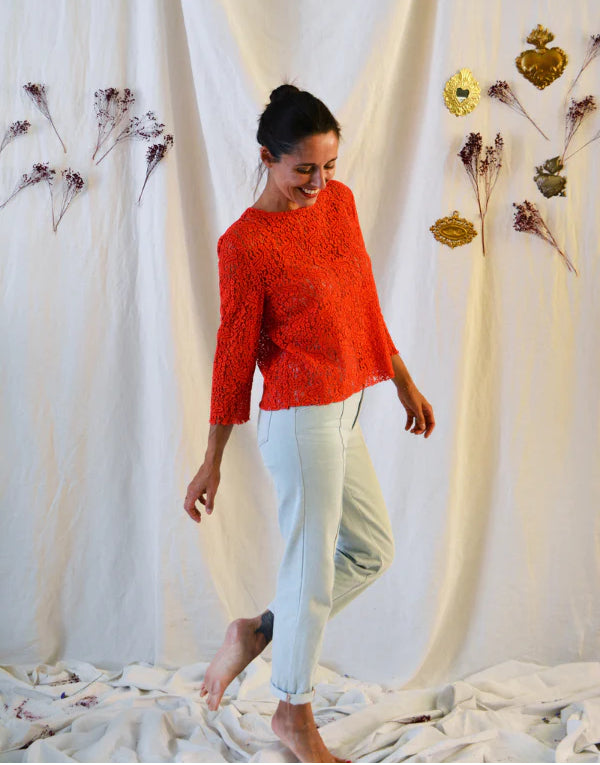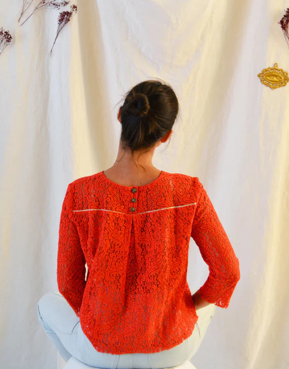 Violette is a blouse with a box pleat on the back and a buttoned placket on the upper back yoke. It presents a fitted line but not skintight, a high round-neck and three-quarter length sleeves with gathered sleeve caps.