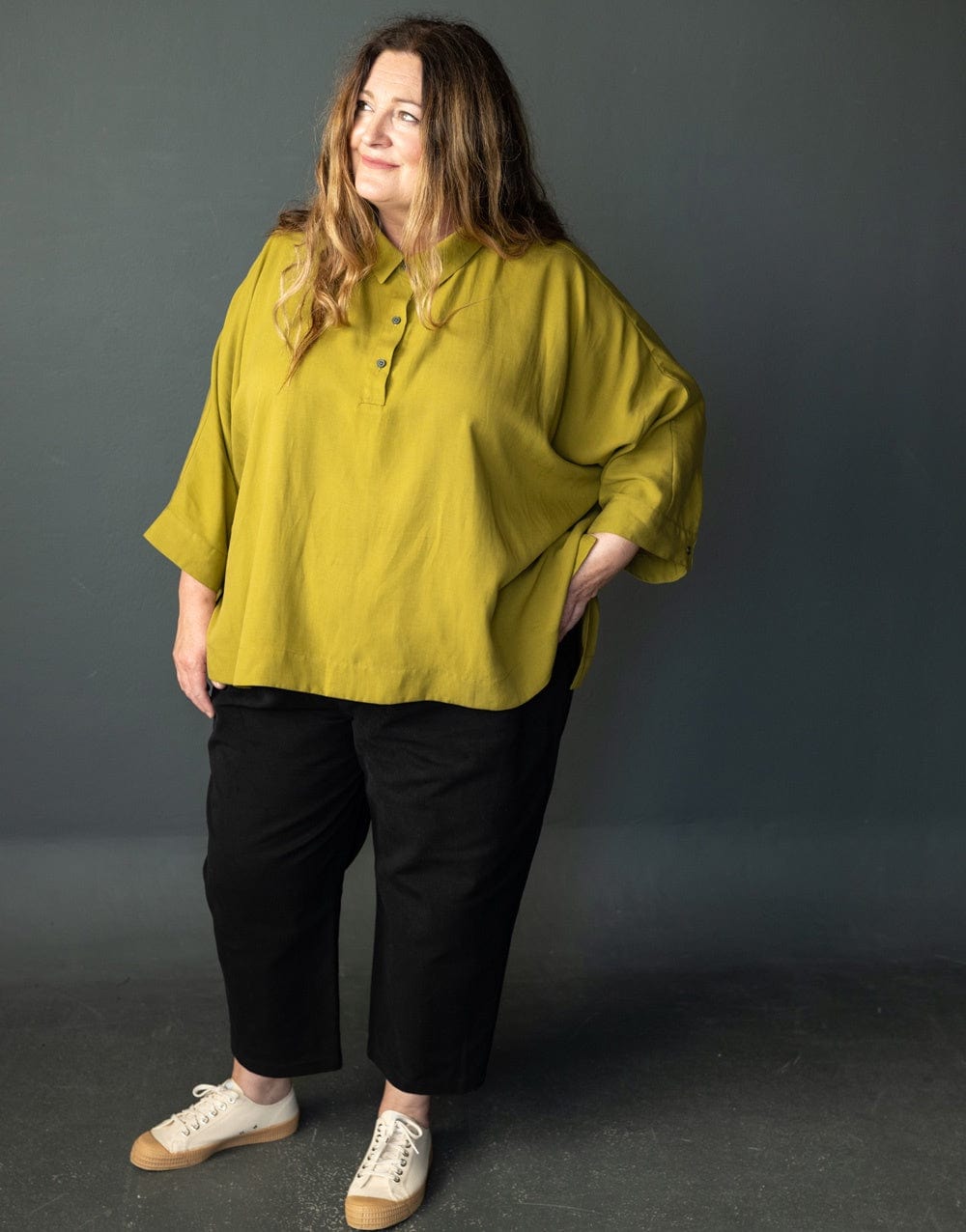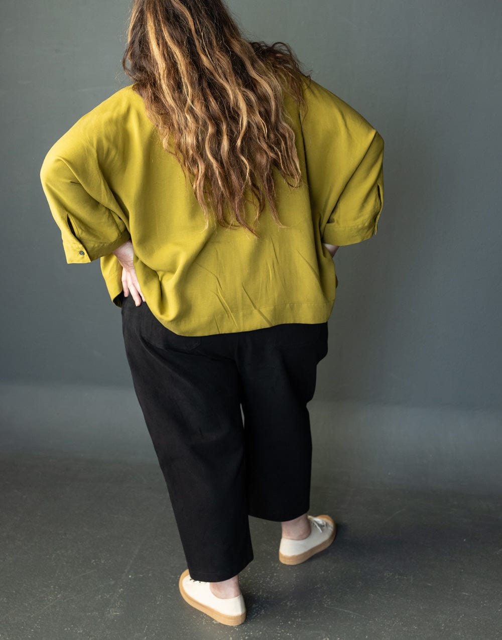 The Eve Trousers are ideally suited to a mid-heavyweight cotton canvas, as this keeps the structured shape. 8oz and 12oz Organic Sanded Twills are ideal. Other options would be corduroy, light-medium weight woollens and 7 – 12oz denim. You can use lighter weight cloths like linen and potentially a Tencel/linen but this will give you a softer silhouette.