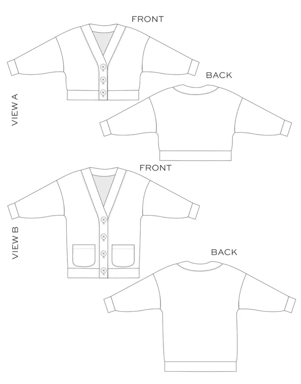 The Marlo pattern is an oversized sweater with a dropped shoulder, deep V-neck, wide bands and large buttons. View A is cropped length. View B has patch pockets and hits above midthigh.