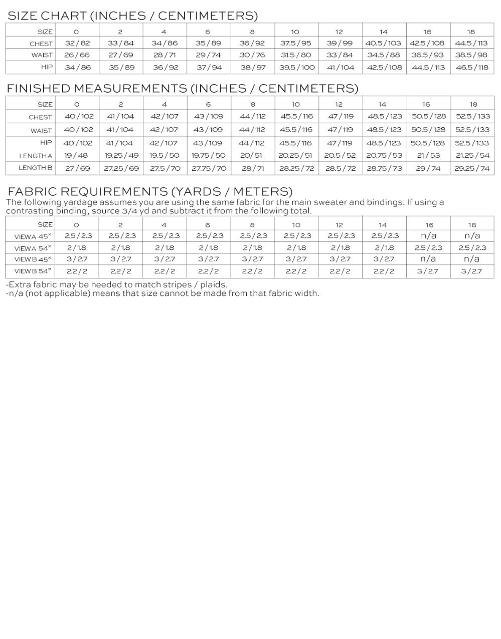 Suggested Fabrics: The main sweater can be sewn up in stretch or nonstretch fabric. The bindings require at least 20% stretch. You can use the same fabric for both or use a contrasting fabric for the bindings. Suggested fabrics include medium weight fabrics such as sweater knit, french terry, sweatshirting, polar fleece, rib knit and boucle.