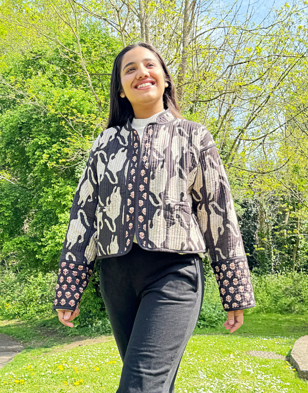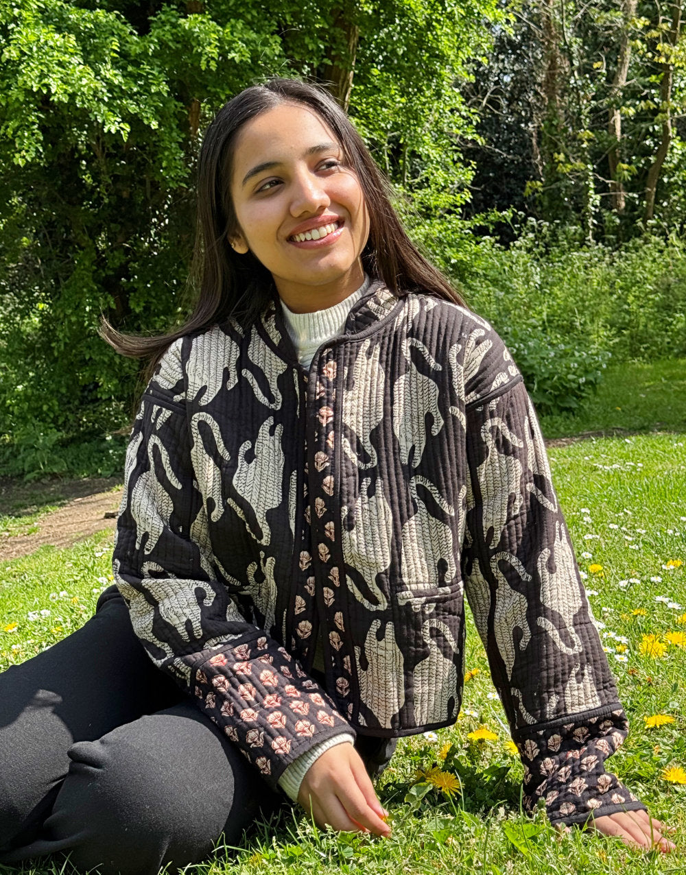 An eye-catching, fully reversible jacket crafted from quilted pure cotton and hand-printed in India. One side features a bold black and beige big cat print; the reverse, a Mughal-inspired mini motif, both finished with contrast sleeves and piped detailing for definition. Lovely padded and just the right weight for all the year round!
