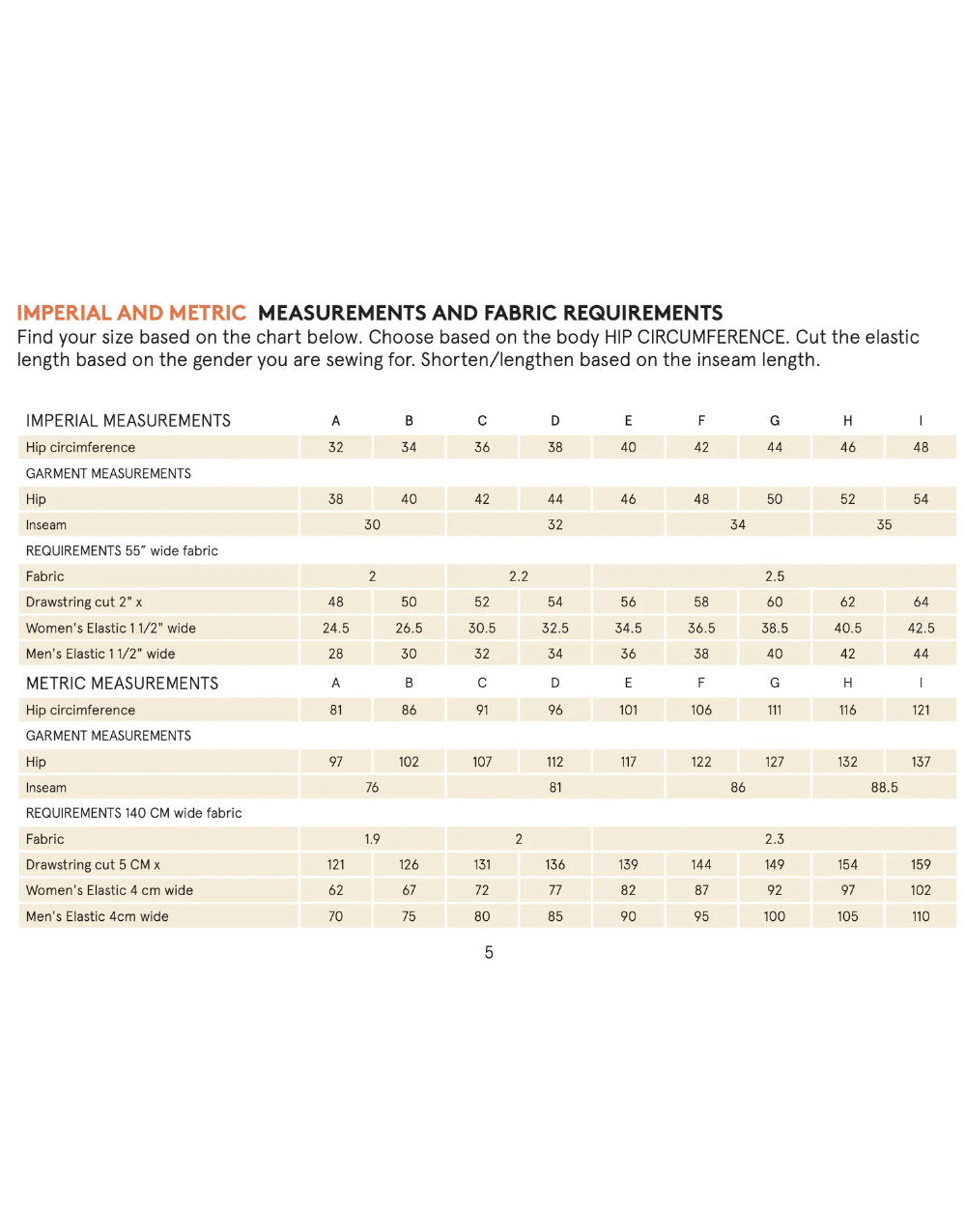 Suggested fabrics: Use soft, lightweight woven fabric such as cotton, silk or viscose. If you choose to make the pants in jersey, you should size down one size.