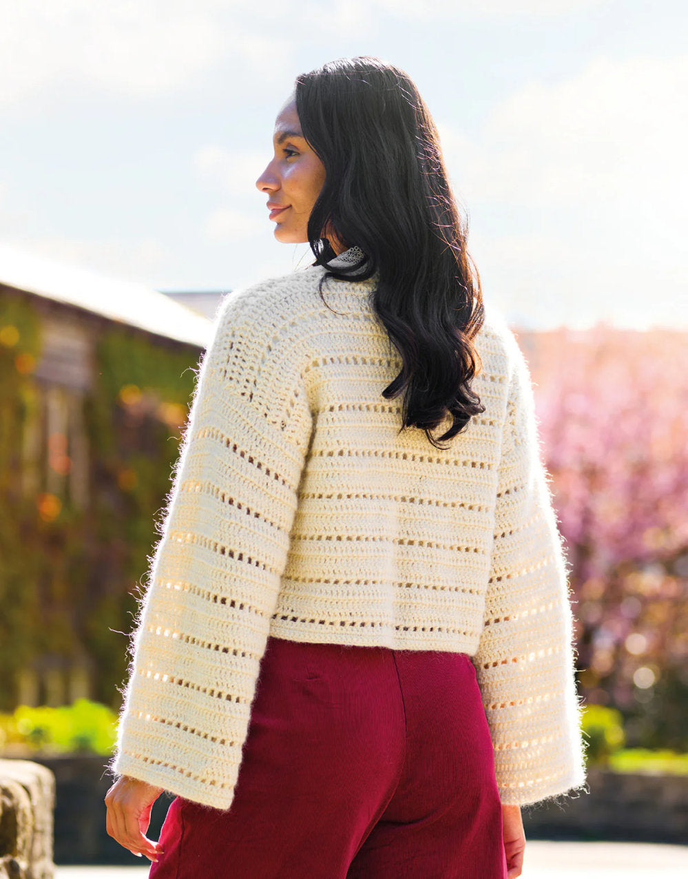 The Pixie Crochet Tie Cardigan from West Yorkshire Spinners is a charming layering piece with a touch of vintage-inspired style. Designed by Cassie Ward in Fable Brushed Aran, it features wide sleeves, soft stripes of texture and delicate tie fastenings down the front. Lightweight yet warm, this cardigan is perfect for adding a handmade flourish to everyday outfits, making it as versatile as it is eye-catching.