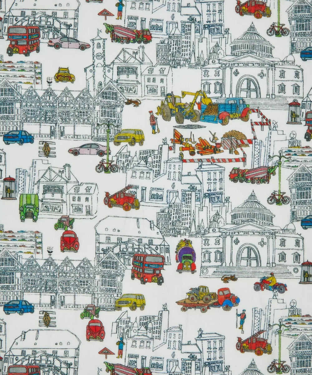 Extraordinary renderings of buildings, machines and even the timber framed Liberty building characterfully populate this London cityscape. The Liberty Design Team extracted and rearranged motifs from their original square formation to make a wearable conversational design spotlighting an array of colourful city sights, from roadworks to lampposts and iconic red buses.