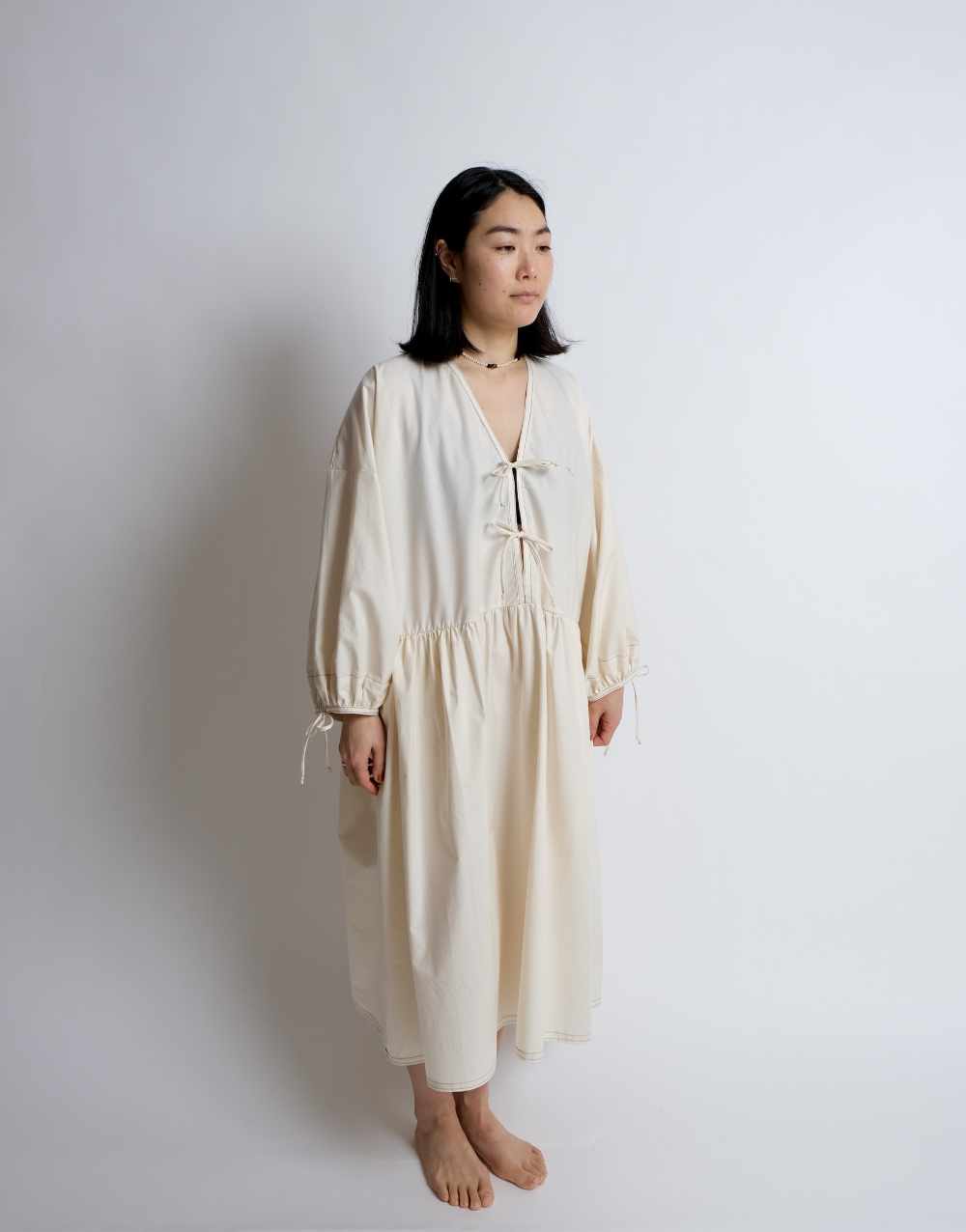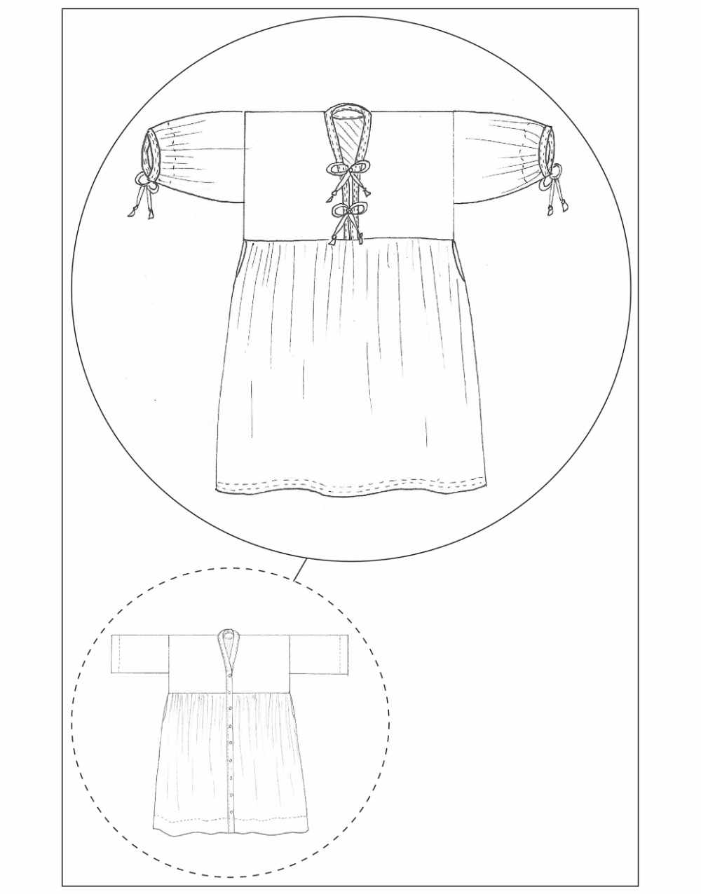 This hack is based on the ZW GATHER DRESS pattern. The neck and centre front edges of the bodice are finished with a binding and close with thin ties. The skirt has side pockets and is gathered and attached to the waist seam. The sleeve features gathers at the hem with a split and thin ties to close.