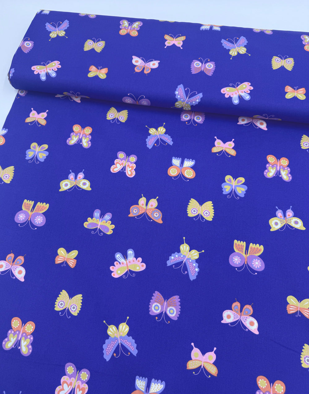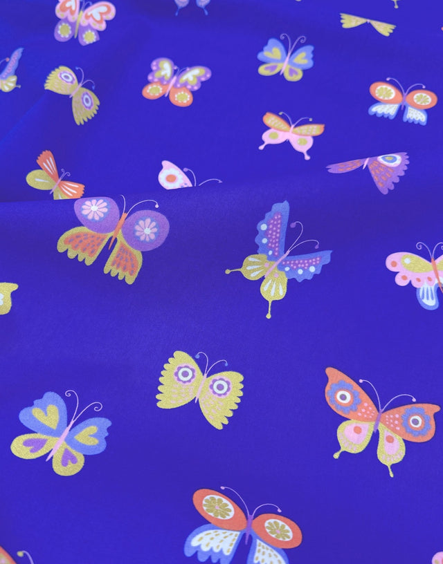 A fine cotton poplin featuring a whimsical butterfly print on a rich royal blue background, accented with delicate glitter highlights for a subtle shimmer. Soft yet crisp, this fabric is perfect for playful and elegant sewing projects.