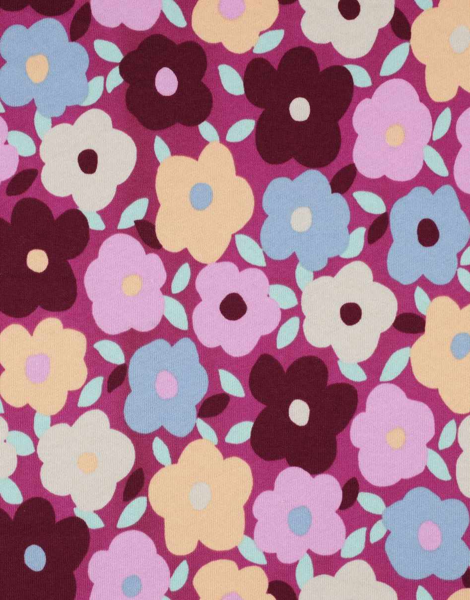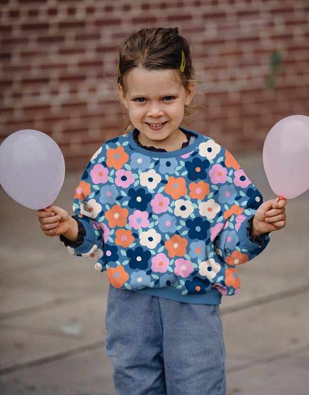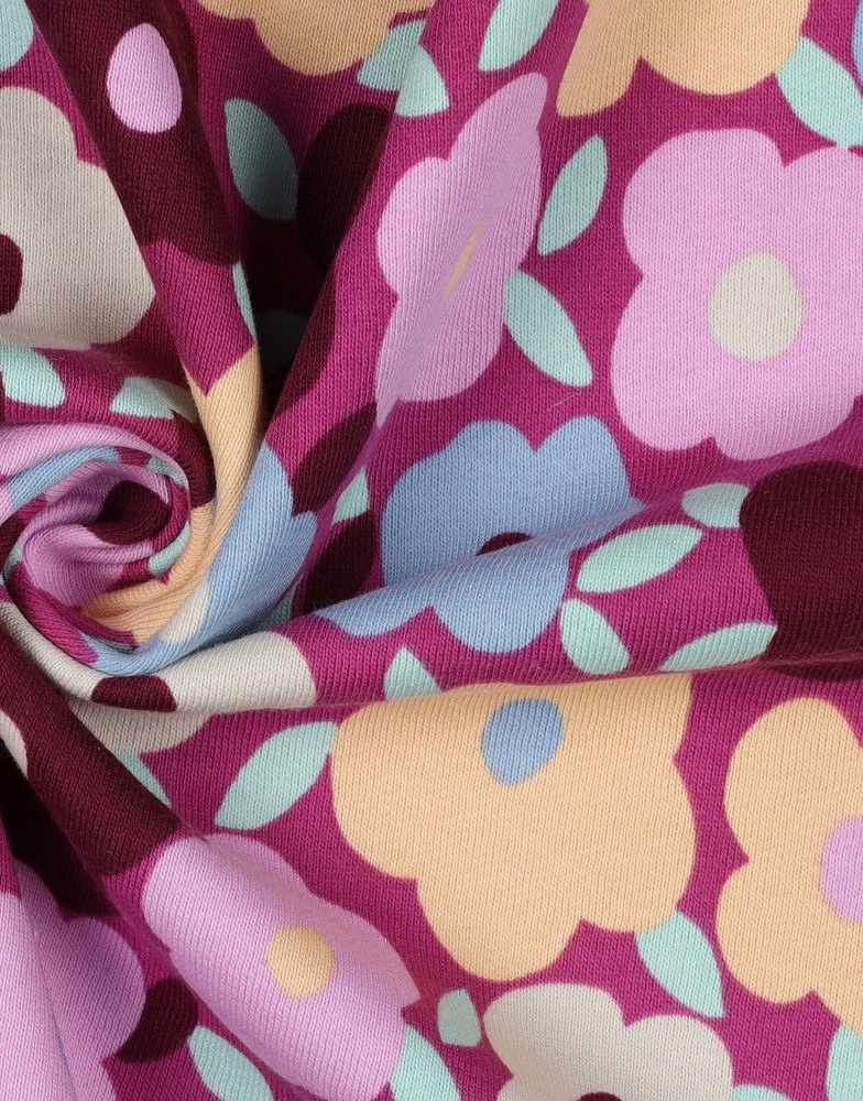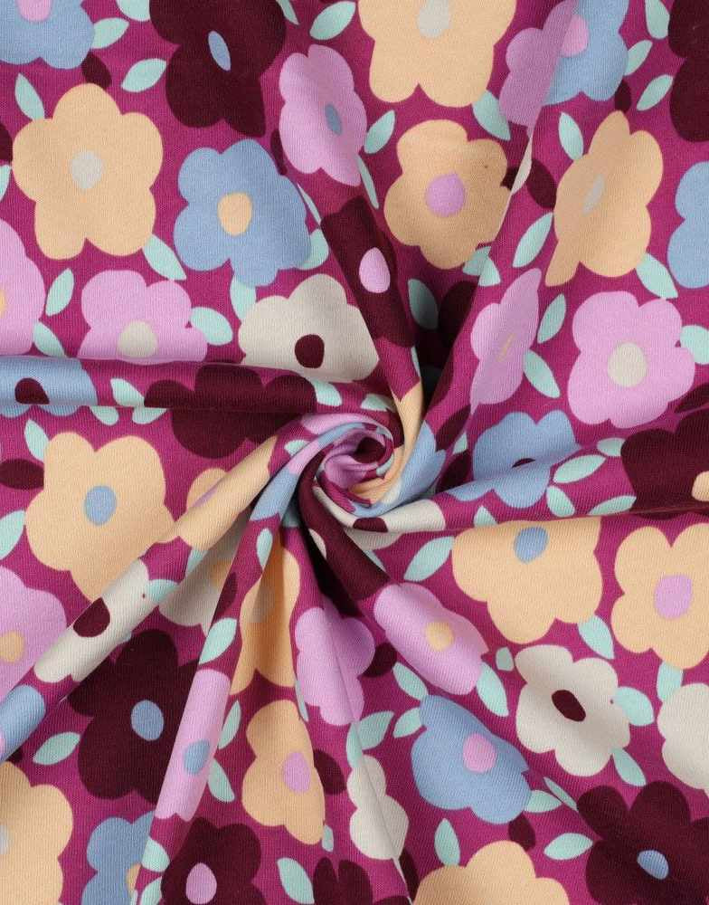 A lovely thick, cosy sweatshirt fabric with a brushed reverse side and a fun big flower print. Sweat fabric or jogging fabric, is a knitted fabric just like jersey but it's a lot thicker and heavier. The fabric is soft and retains warmth well, it's ideal for hoodies and jogging suits, among other things.