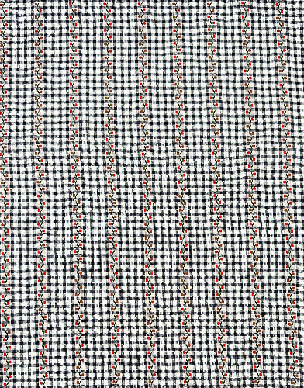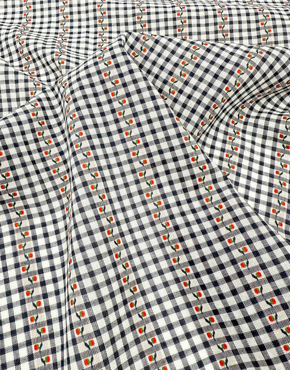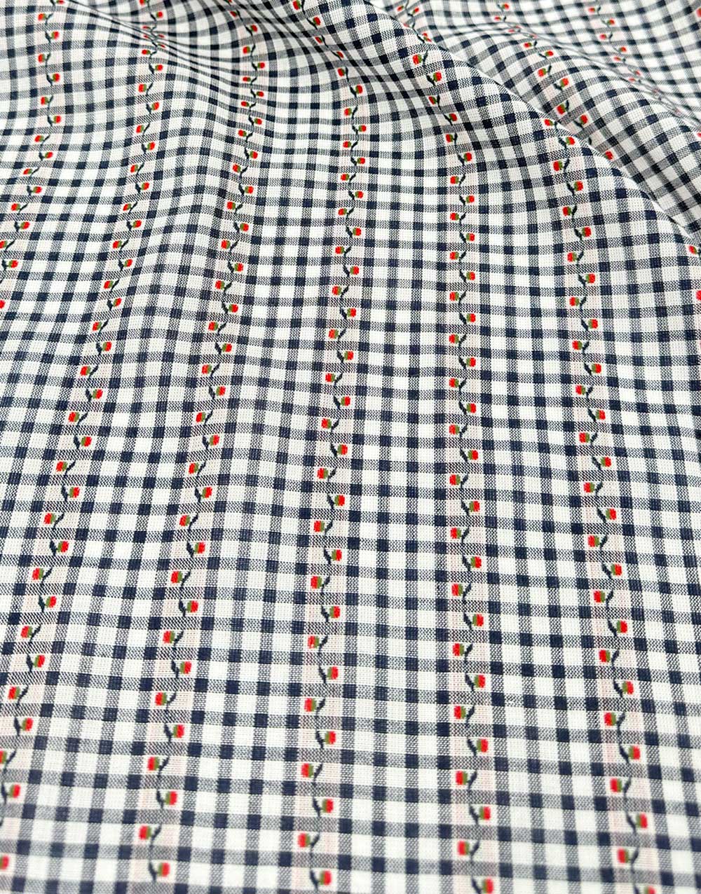 This beautifully soft cotton gingham is given a delicate twist with embroidered blossom stripes, woven into the fabric in a subtle jacquard effect. The navy and white check has a gentle drape, making it perfect for light, summery garments with a touch of charm. Ideal for soft pyjama bottoms, breezy blouses, children’s wear, or relaxed dresses, it combines comfort with a playful vintage feel.