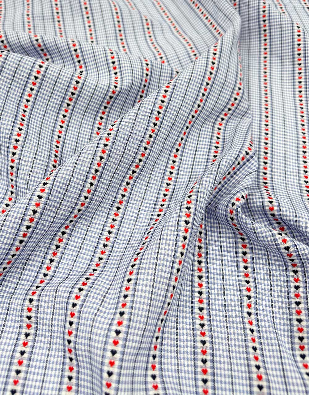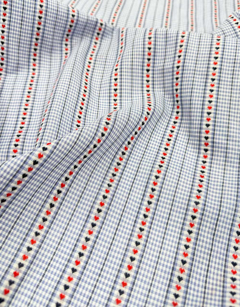This light blue gingham cotton is softened with embroidered jacquard stripes, each decorated with rows of tiny red and navy hearts. Lightweight and airy, it feels gentle against the skin and has a soft drape Read more