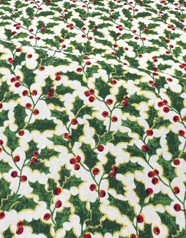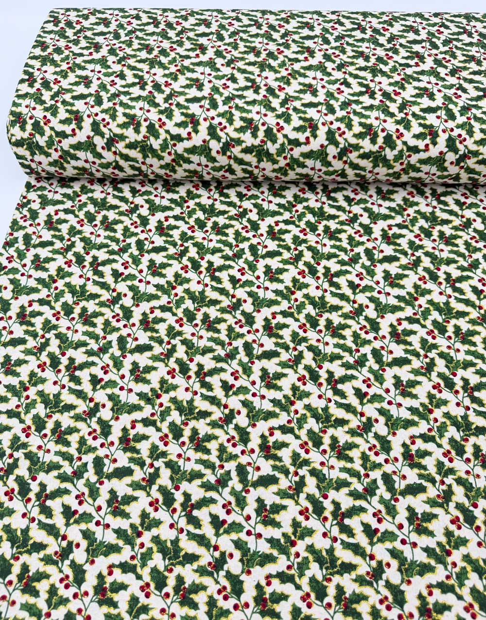 This festive cotton is adorned with classic holly leaves and bright red berries, beautifully highlighted with a shimmering gold metallic outline Read more
