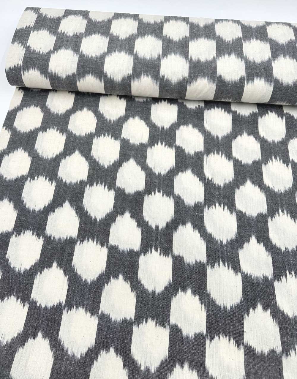 This Ikat woven cotton fabric features a bold, graphic design with the signature blurred-edge effect of traditional Ikat weaving. Its monochrome palette enhances its modern yet timeless appeal, making it a versatile choice for both contemporary and classic styles. Lightweight with a beautifully textured weave, this fabric offers a striking yet effortless look.