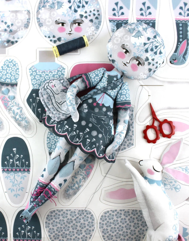 Meet Moon Girl and Ruby Rabbit, two celestial friends brought to life through this enchanting DIY sewing kit. Stitch up Moon Girl with her dreamy rabbit constellation skirt, sleeping cat bag, and bunny-adorned boots, and bring along her loyal companion, Ruby Rabbit. Their story unfolds in the little book included, telling the tale of how these two met under a starry sky.