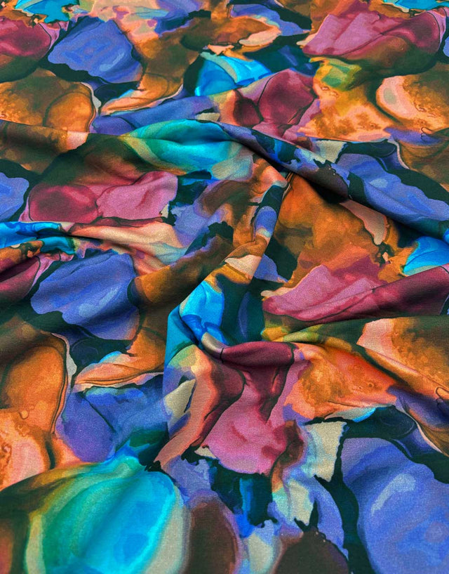 French terry jersey fabric with a striking inky design in rusty tones and blues and purples.